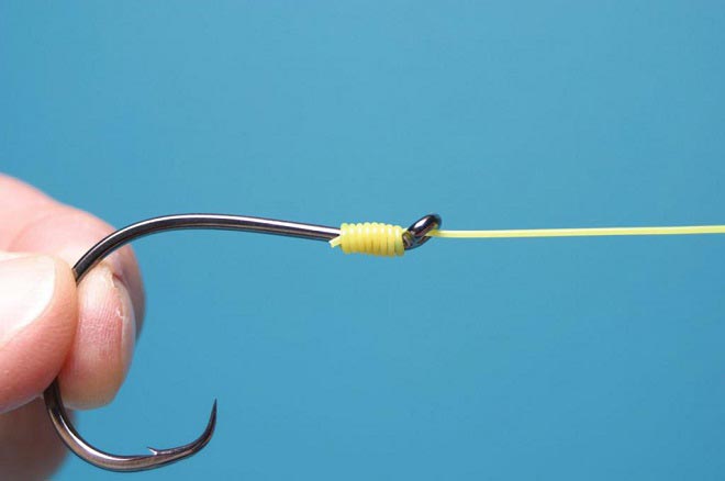 Благодаря рыболовному узловому соединению «Snood» вы сможете прочно зафиксировать крючок с лопаткой. Такой узел можно создавать как на тонкой, так и на средней леске. При этом стоит учитывать закономерность, чем тоньше леска, тем большее количество витков вокруг цевья рекомендуется произвести. Опытные рыбаки не советуют делать меньше пяти витков.