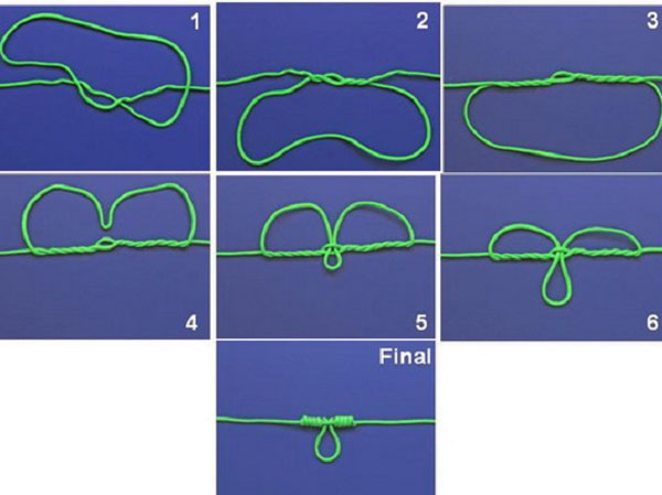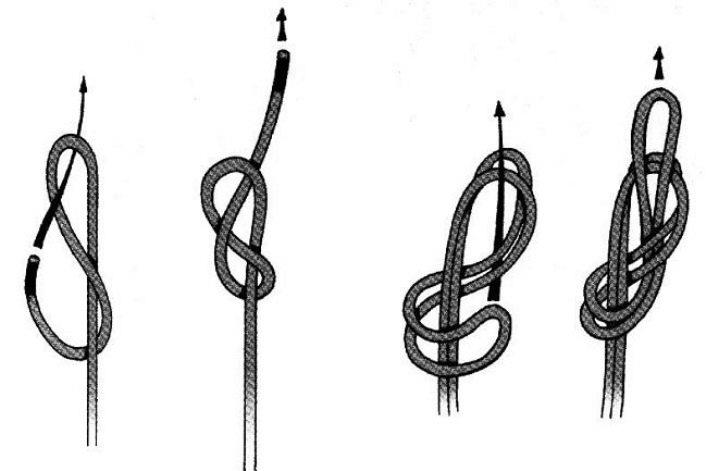 Его часть обматывается леской, образуется не один виток. Затем намотка стягивается, кончик намотанной нити и ее остаток подтягивается так, чтобы получилась восьмерка.