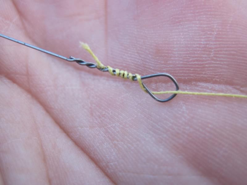 Теперь обматывают первым часть лески и тянут конец вверх. Таким образом образовалась петля, поводковый материал заводят в нее, но стягивать еще рано.