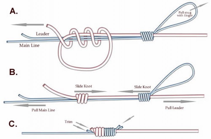 ОТВЕТ: Более надежное, чем предыдущее узловое соединение. Однако, по сравнению с «кровавыми узами»применяется для соединения монолесок различающихся по толщине не более чем на 20%. Используется для соединения не только двух монофильных лесок, но и монолески и плетеного шнура. Применяется для привязывания к основной леске флюрокарбонового поводка.
