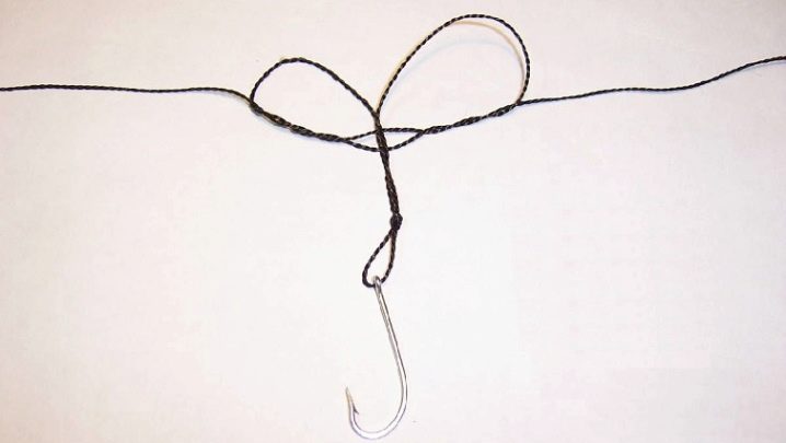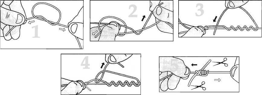 - Конец поводковой лески с крючком продевают сквозь петельку на нем;