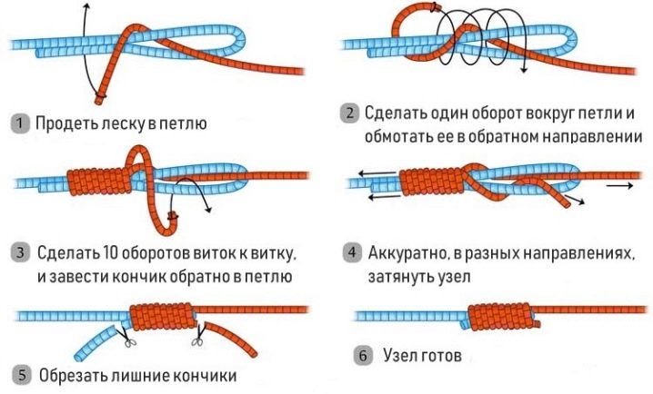 - Разведя лески и потянув за их концы, окончательно затягивают узел;