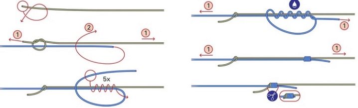 - Связываемые лески складывают вместе таким образом, чтобы при этом они своими концами направлены в разные стороны;