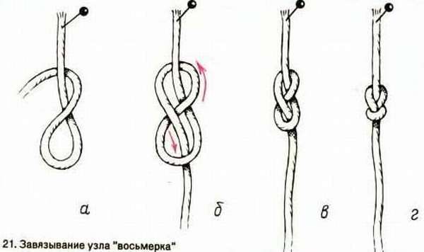 Ещё есть петля «восьмёрка», которая позволяет быстро крепить карабины, крючки, вертлюги и иные элементы оснастки. Вяжем её таким образом: