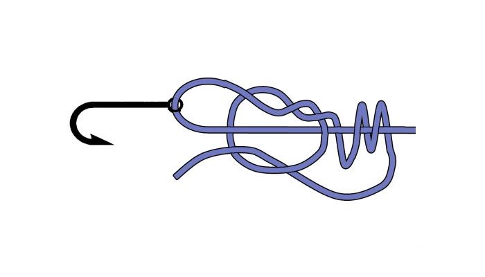 - пропустить изогнутую часть лески поверх крючка, над узлом, в обхват его;
