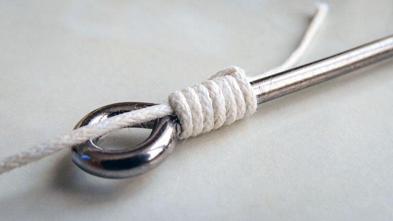 - обернуть пять раз ту часть нити, которая осталась, вокруг обоих концов, пропуская леску через образовавшийся промежуток;