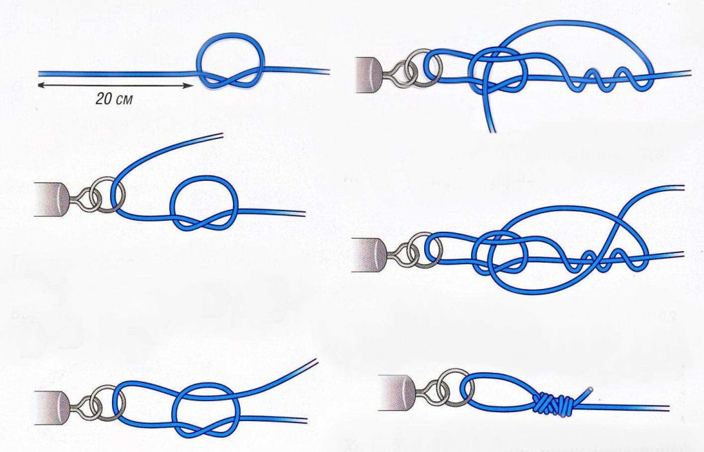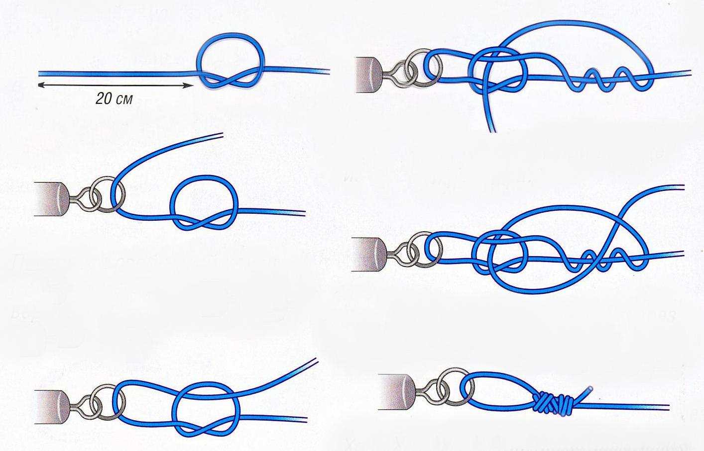 - Если используется тонкая леска, то узел для вертлюжка, должен быть простым, чтобы волокна лески не сильно подвергались деформациям во время монтажа.