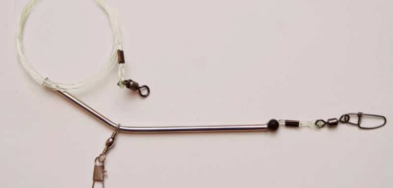 - на основной сдвоенной леске вяжется простой узел с вертлюжком внутри;