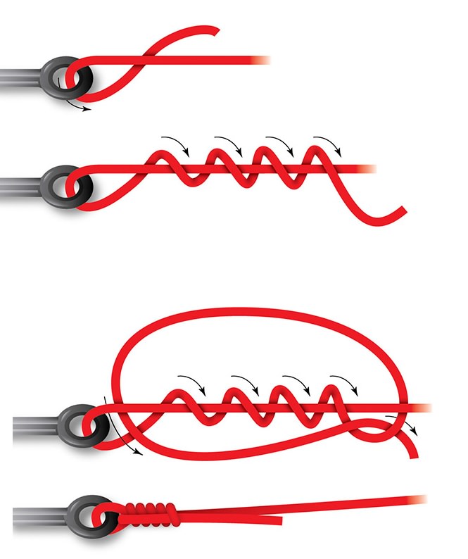 Но можно принять за основу поправку: меньше диаметр лески — больше витков. При затягивании петель образуется зона повышенного напряжения, что приводит к растяжению и истончению волокна нити.