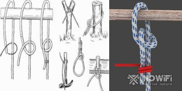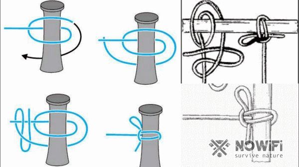 Отличие в вязке этого узла от простого варианта сводится к тому, что вместо начального простого узла вокруг опоры вяжется восьмерка.