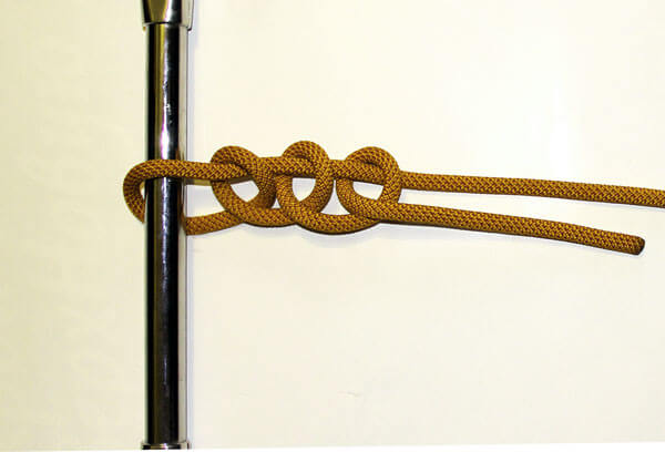 - Ходовой конец привязывается к коренному контрольным узлом. Теперь можно смело говорить о том, что веревка правильно и надежно закреплена к опоре.