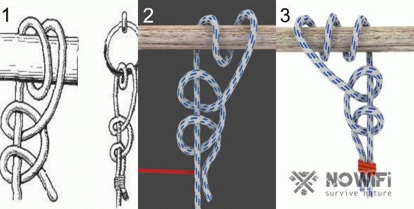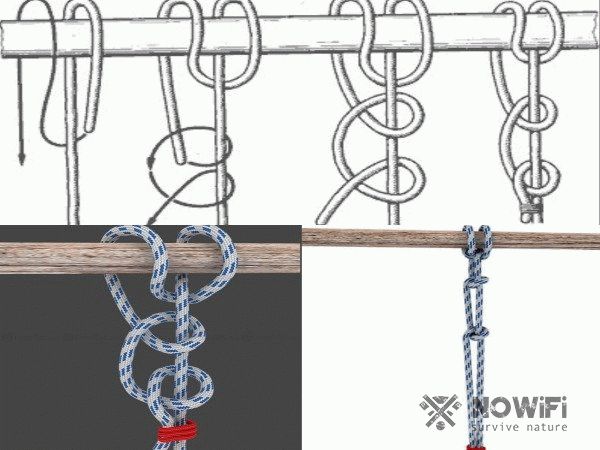 Узел на перекладине Это что-то типа гибрида между Выбленочным узлом и Констриктором (Сжимающимся узлом). Он держится лучше, чем Выбленочный узел, в случаях, когда с одной стороны находиться больший груз, чем с другой, а развязывается легче, чем Сжимающийся узел. Чтобы